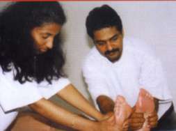 Massage, hier werden kleine Stoffbeuetel mit einer besonderen Reissorte(Navara) gefüllt, der bereits in ayurvedischen Milch gekocht wurde. Damit wird dann der ganze Körper massiert. Diese Behandlung wird bei Lähmungserscheinung und Muskel und Knochenerkrankungen angewandt. |