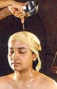auf den Rücken auf der ayurvedischen Massagebank.Es wird eine Flüssigkeit unter kontinuierlichem Fluß auf die Sirn von einer Schläfe zur anderen gegossen. Diese wird je nach Person und Befinden individuell ausgewählt und reicht von Kräuterabkochungen, über medizinisch aufbereitete Milch bis zu ayurvedischen Ölen. Besondere Erfolge sind bei kronischen Kopfschmerzen, Schlafstörungen,Ohren- und Nasenerkrankungen, sogar bei Psoriasis - Erkrankungen(Schuppenfechte) ist diese Therapie sehr effektiv. Mindest Behandlungsdauer ist drei Tage. |